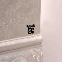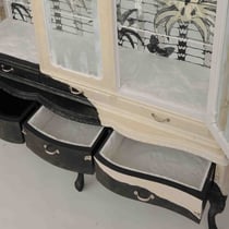 La Cage aux secrets a pour base un meuble qui a été totalement dépouillé et recouvert de résine, de feuille d’Or, de cuir d’autruches, de fausse fourrure de grillage, d’accessoires de récupération et de Dibon imprimé. Puis une fois les secrets écrits sur des papiers collés librement sur des fils et dans les tiroirs, il a été scellé, pour garder ses secrets éternellement, à moins que…
